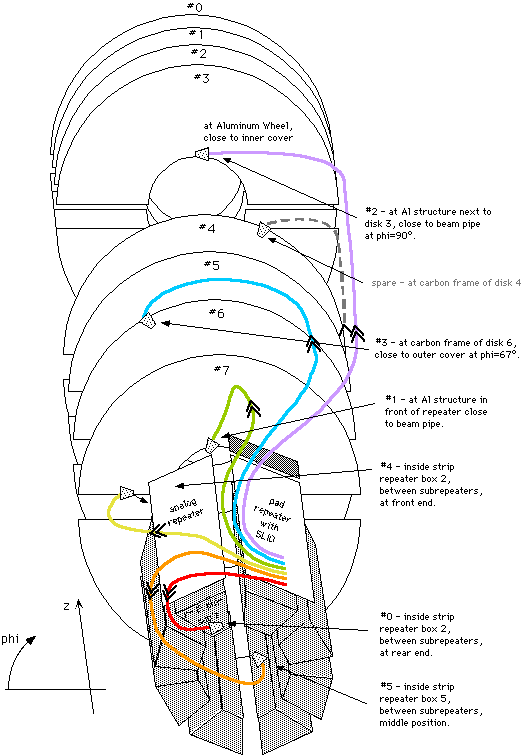 This is the arrangement of temperature sensors after the short shutdown in May 1999 - the number of sensors has been rised to the maximum possible and their distribution changed in order to investigate heat dissipation inside the electronic boxes. (Colors correspond to the online display.)
