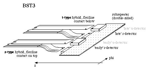 The sketch shows how the flex extensions of the hybrids are connected. Note that according to the type of hybrid the contacts engage from top or bottom of the subrepeater. Six subrepeaters are piggy-backed to the BST repeater.