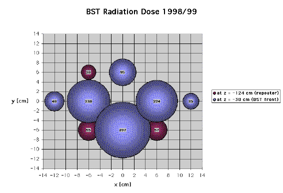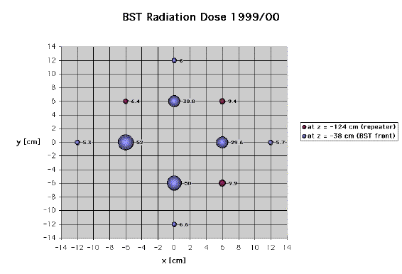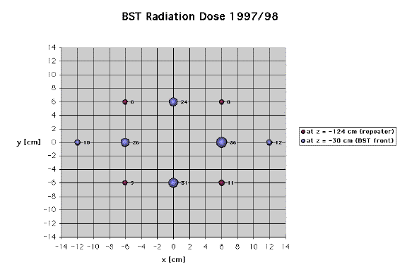 This is the arrangement of film dosimeters at the BST throughout the recent running periods (Colors indicate the years).